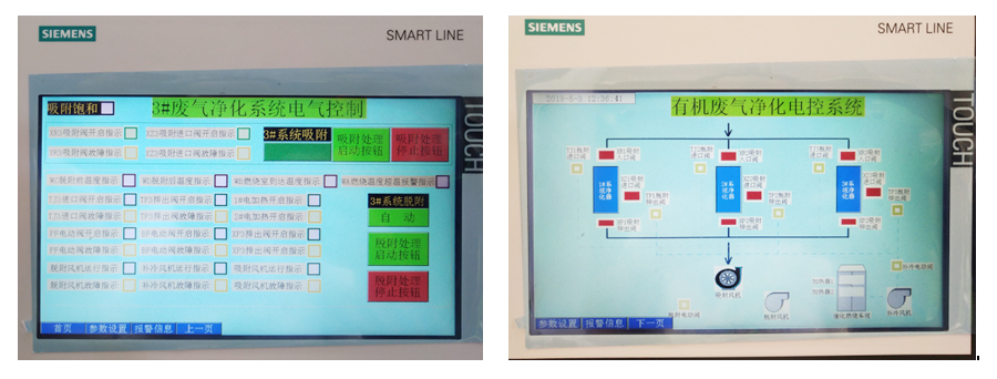 該系統采用CCO型凈化裝置一套,處理風量為2000m3/h,功率60kw,電加熱工作時間約半小時,當催化床溫度達到250~300℃時,催化燃燒床開始反應,利用廢氣反應產生的熱空氣循環使用,此時電加熱停止,不需要外加熱,單床脫附,脫附時間為±2小時,設定時間活性炭吸附箱定時自動切換脫附,內部裝填的陶瓷蜂窩體貴金屬催化劑使用壽命為20000小時。整個脫附系統采用多點溫度控制,保證脫附效果的穩定。