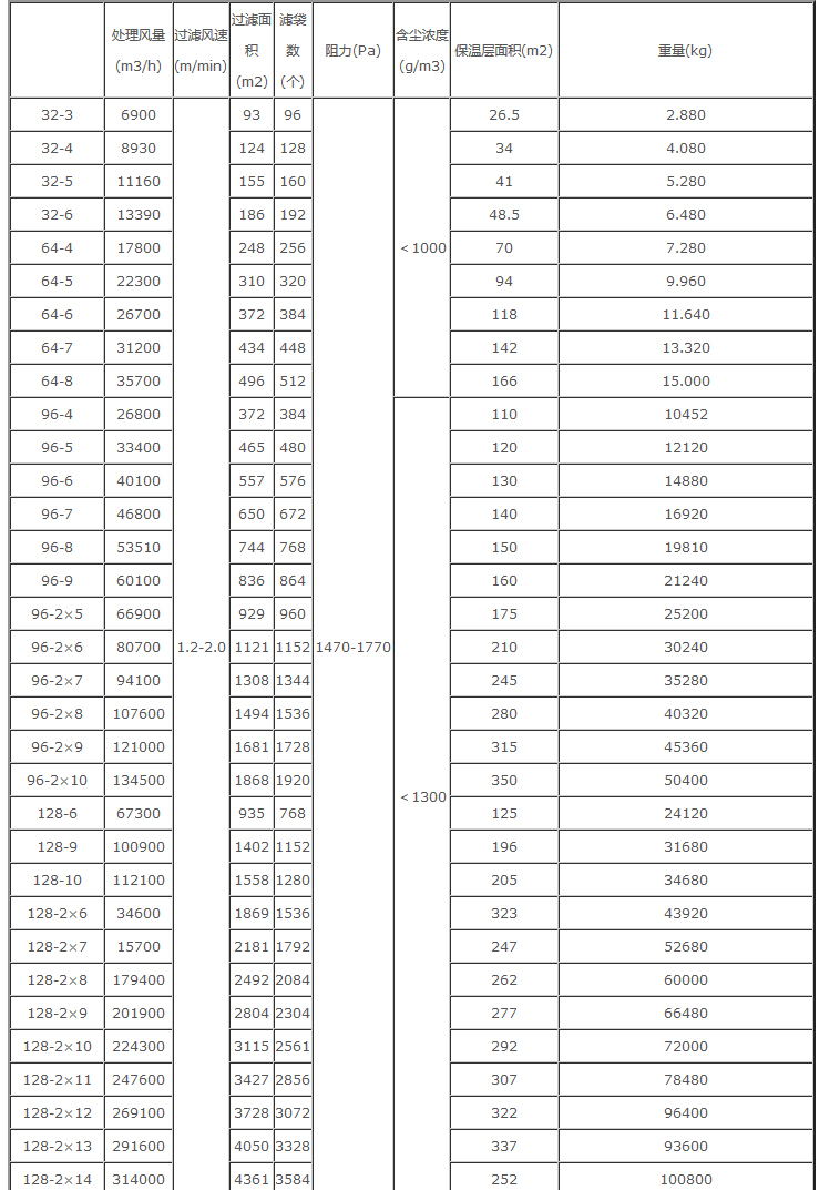 本系列產(chǎn)品共有33種規(guī)格,每室的袋有32、64、96、128袋四種,濾袋長度有2450mm和3060mm兩種,收塵效率可達(dá)99.9%以上,凈化后氣體的含塵濃度小于50mg/m3(標(biāo))本系列收塵器如用于寒冷地區(qū),當(dāng)室外采暖計算溫度≤-25℃時,要設(shè)熱裝置。